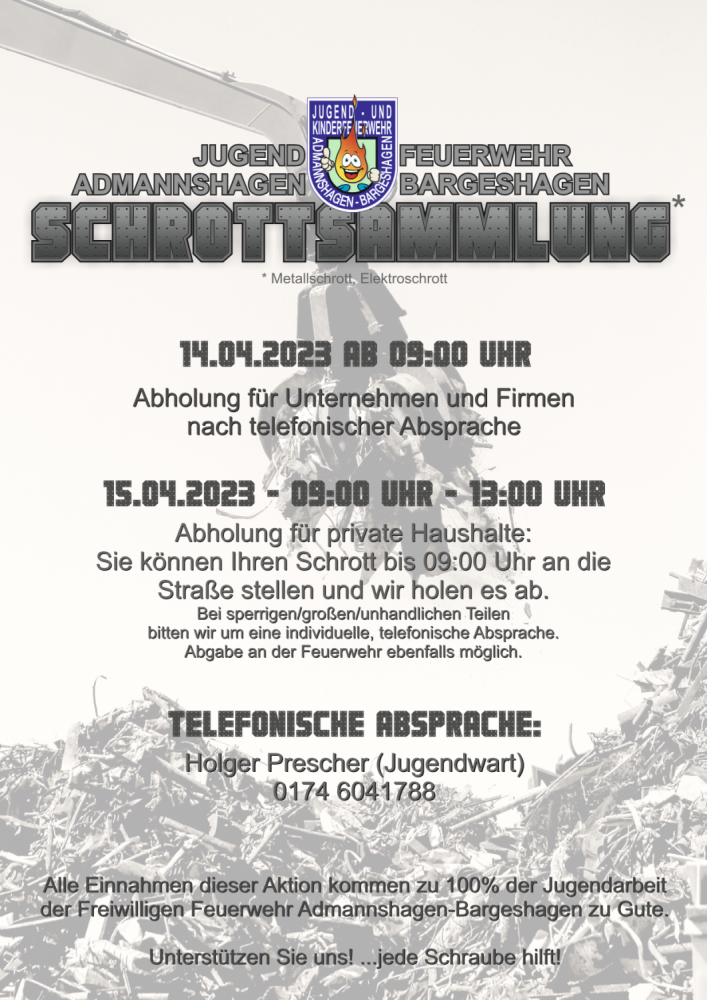 am 15.04. sammelt unsere Jugendfeuerwehr in der gesamten Gemeinde Admannshagen-Bargeshagen Schrott. Das Geld welches Sie einnehmen, kommt unseren Kindern & Jugendlichen aus der Jugendfeuerwehr zugute.